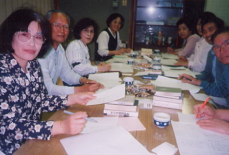 | 句会風景 | 河東碧梧桐,森遅日の直筆の俳句の前で |