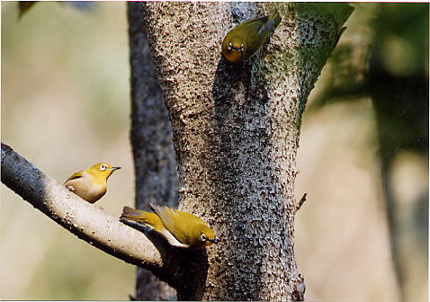 | メジロ ( 留鳥または漂鳥 ) チュルリ、チュルリとかわいい鳴き声の方を見るとメジロが群れで飛びまわっていた。かなり動きが激しく1ヶ所にじっとしていないがあまり人怖じもしなかった。 |
