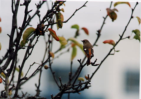 | ジョウビタキ ( 冬鳥 ) 家のまわりにこんなかわいい鳥が来ていたなんて。わりと人怖じしなくて遠くまで逃げない。翼の白いワンポイントマークがわかりやすい。あちこちにいる。 |