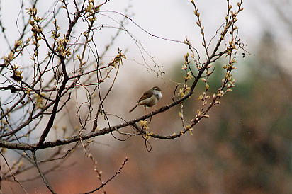 ウグイス ( 漂鳥または留鳥 ) 竹やぶの中から声はよく聞こえる。しかし、なかなかその姿は見えず。初めて鳴いているこの鳥を見た時は超感激。のどがふくらみ、体全体で鳴いていた。 |