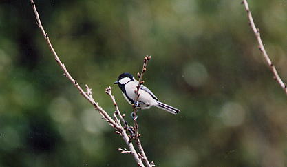 シジュウカラ ( 留鳥 ) カメラを持って山際の道を歩いていると、この鳥が飛んできた。ゆっくりと電線や植木のまわりを飛んでくれた。胸のネクタイ模様がとても印象的。 |