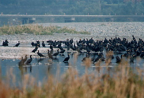 カワウ ( 留鳥 ) 最初はカラスの集団かと思った。裏の川原でこんなにたくさん見たのは初めて。少し近づくと、一斉に飛び立った。それは圧巻だった。 |