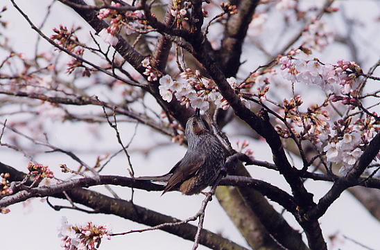 | ヒヨドリ ( 留鳥 ) 年中ピーピーと元気に鳴いている。桜の季節にはこの鳥がやってくる。花から花へと飛び回り、おいしそうに蜜を吸っている。 |