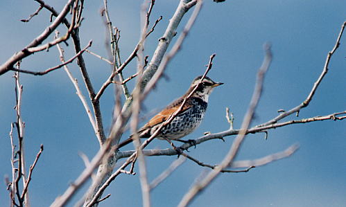ツグミ ( 冬鳥 ) 畑で見たのが最初である。背中の赤茶色が鮮やかである。又、腹部の斑点もよく目立つ。比較的ふっくらとしているのをよく見かける。 |