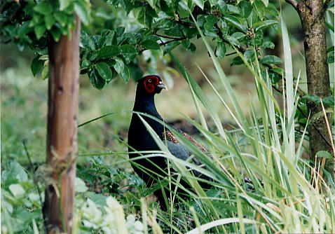 | キジ ( 留鳥 ) 犬の散歩コースにて初めてそれを見た。あまりにも色鮮やかなので驚いた。ゆっくりと近づくと、飛び去ることはなかった。 |