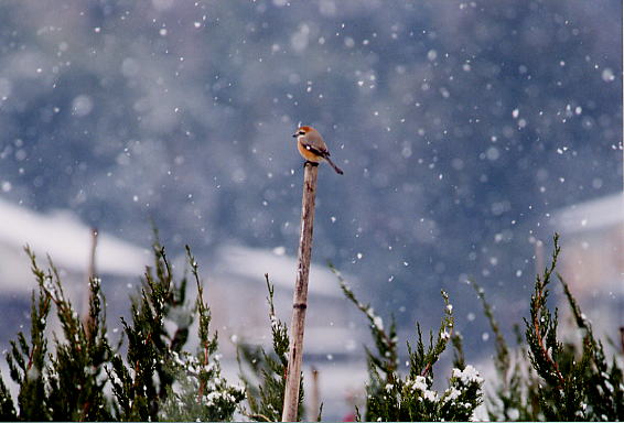 モズ ( 留鳥または漂鳥 ) 嘴が鋭い。尾っぽをぐるぐると回す。木の上などわかりやすい所にいる。雪の中でも目立った。あちらこちらでよく見かける。 |