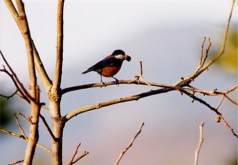 | ヤマガラ ( 留鳥 ) ドングリみたいな木の実をくわえていた。傍でじっと見ていても逃げなかった。さえずりはツツン、ピーとかわいく鳴く。 |